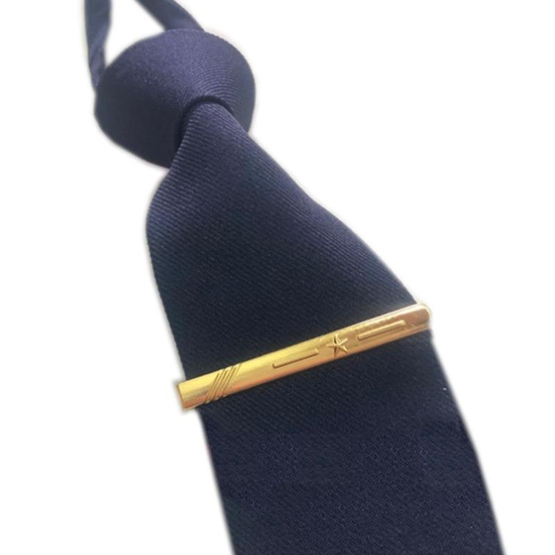 - Kẹp cài cà vạt bảo vệ có chất liệu bằng kim loại mạ màu vàng, in hình ngôi sao.