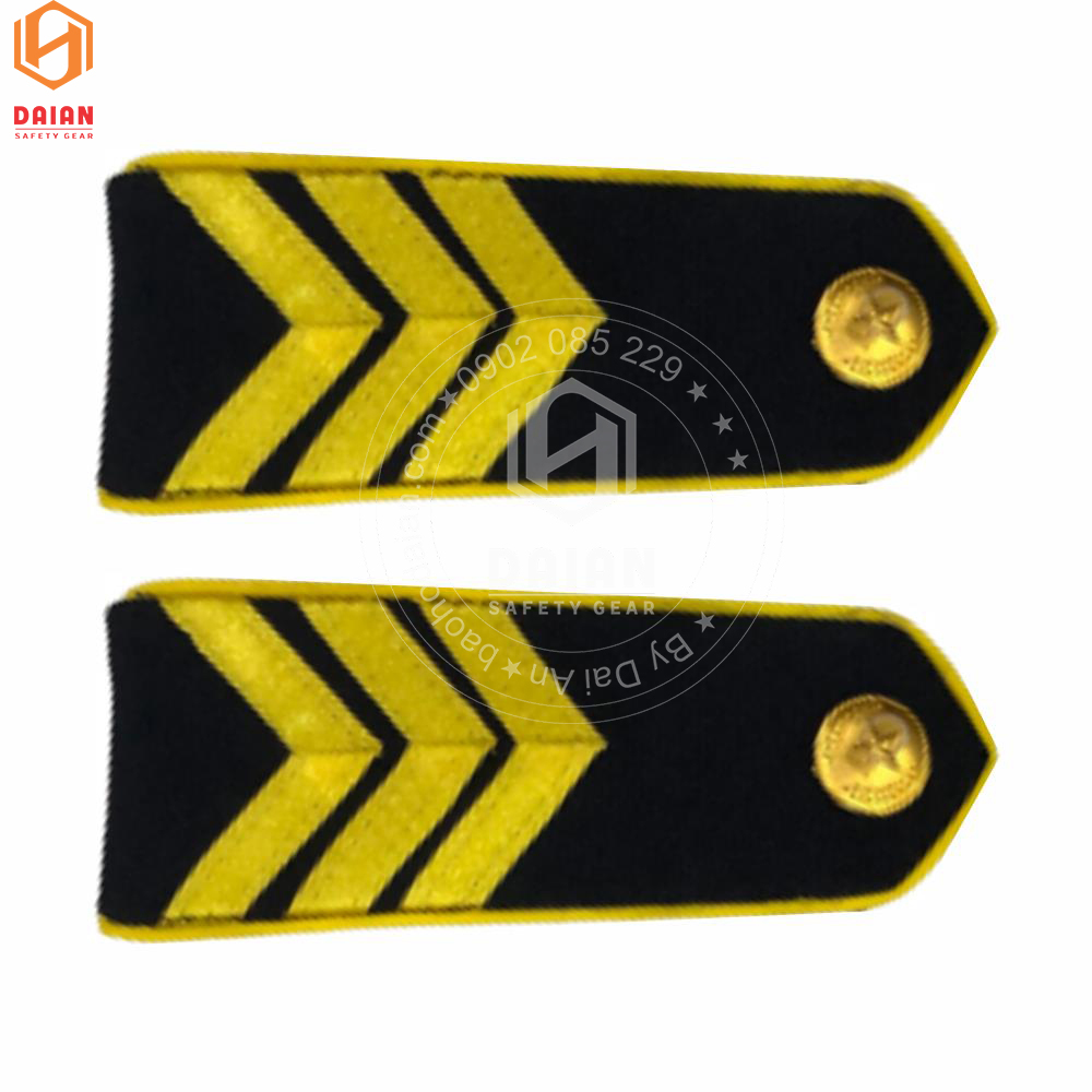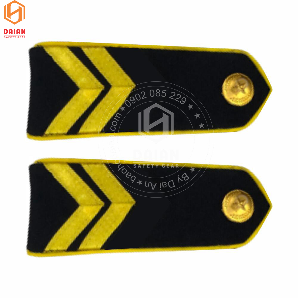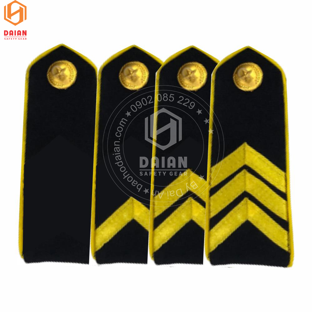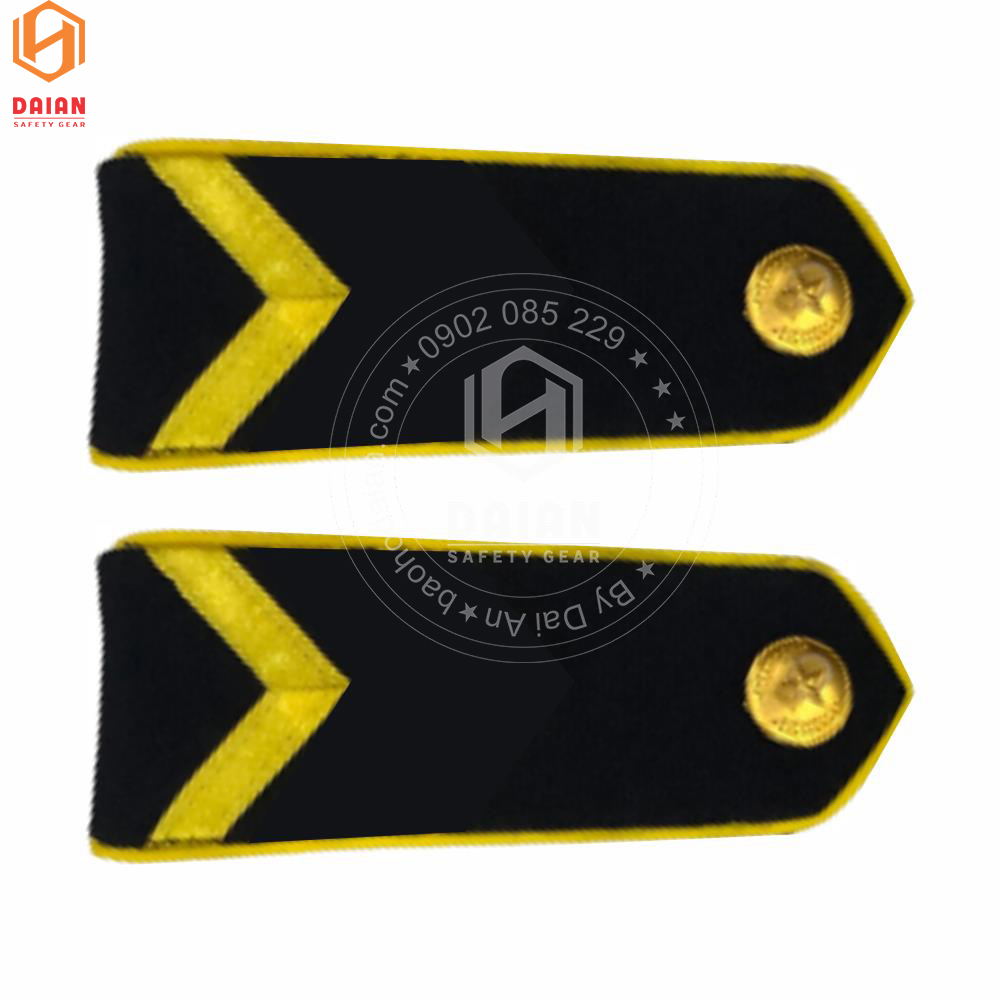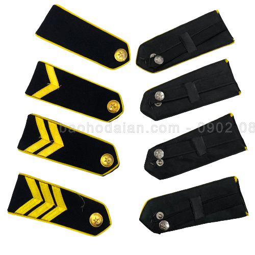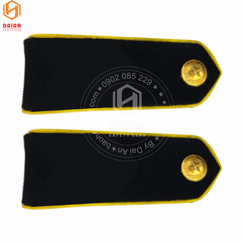 - Nền cầu vai có màu đen, viền xung quang màu vàng, cúc cấp hiệu màu vàng và vạch ngang phân cấp màu vàng tươi.