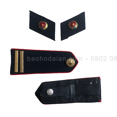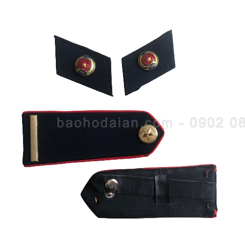 - Nền cầu vai có màu đen, viền xung quang màu đỏ, cúc cấp hiệu màu vàng và vạch ngang phân cấp màu vàng đồng.