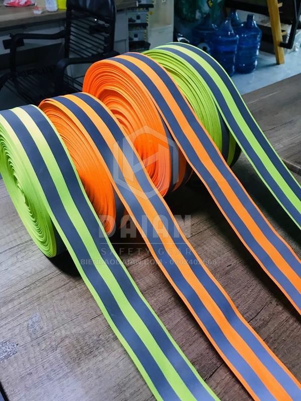 - Phản quang vải 2 sọc màu cam khổ 5 cm x 1.5 cm dài 100 m