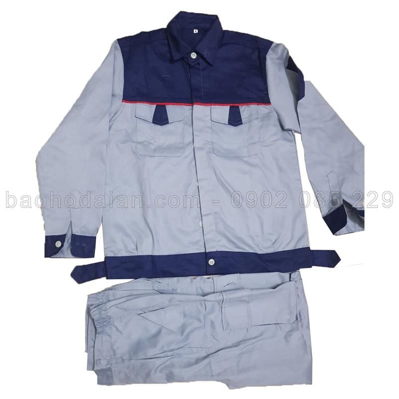 Quần áo bảo hộ công nhân may sẵn xám trắng phối xanh đen M14