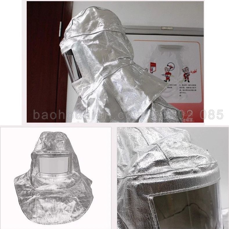 - Mũ trùm đầu: Làm bằng sợi tổng hợp tráng nhôm chịu nhiệt chống cháy giống bộ quần áo, có kính chống cháy. Chịu được nhiệt độ lên tới 1000 độ C